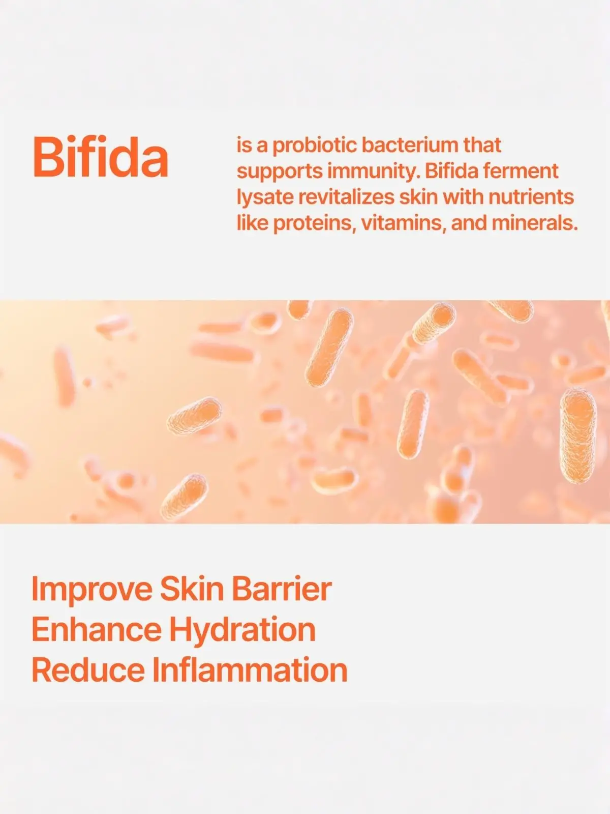 - Bifida Ferment Lysate %65: Cilt mikrobiyotasını dengeler, bariyer fonksiyonunu güçlendirir, nem kaybını önler ve UV hasarını onarır.