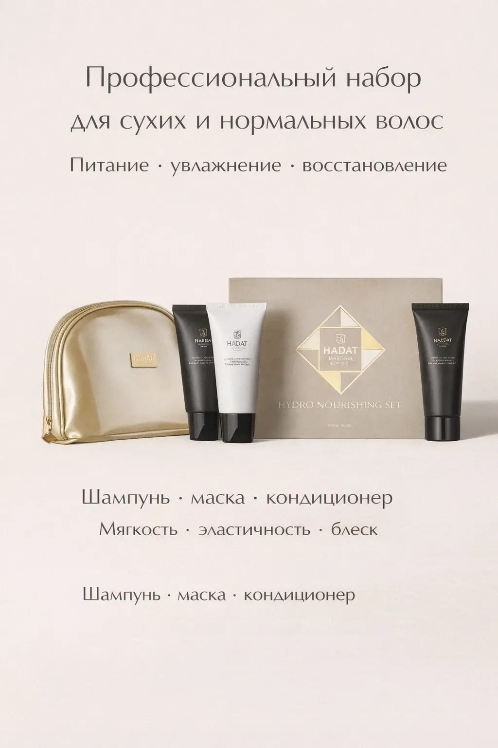 HADAT Hydro Nourishing Moisture Set, kuru ve normal saçlara dengeli bakım sunar, nem seviyesini geri kazandırır ve saçları güçlendirir. Aktif içerikler saçın moleküler yapısına nüfuz ederek yoğun besleme sağlar. Düzenli kullanımda saçlar sağlıklı parlaklık, yoğunluk, elastikiyet ve yumuşaklık kazanır. Setin ürünleri şampuan, saç maskesi ve saç kreminden oluşur.