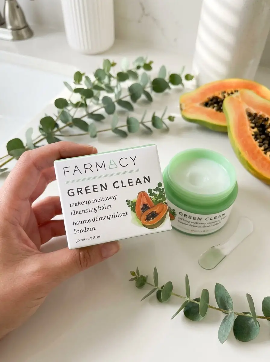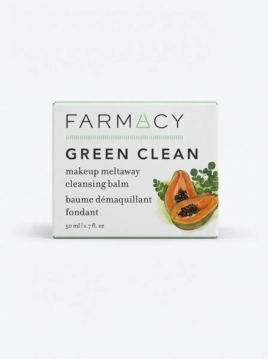 Farmacy Green Clean Cleansing Balm, katı balm formundan yağ dokusuna dönüşerek makyajı ve güneş koruyucuyu kolayca çözer.