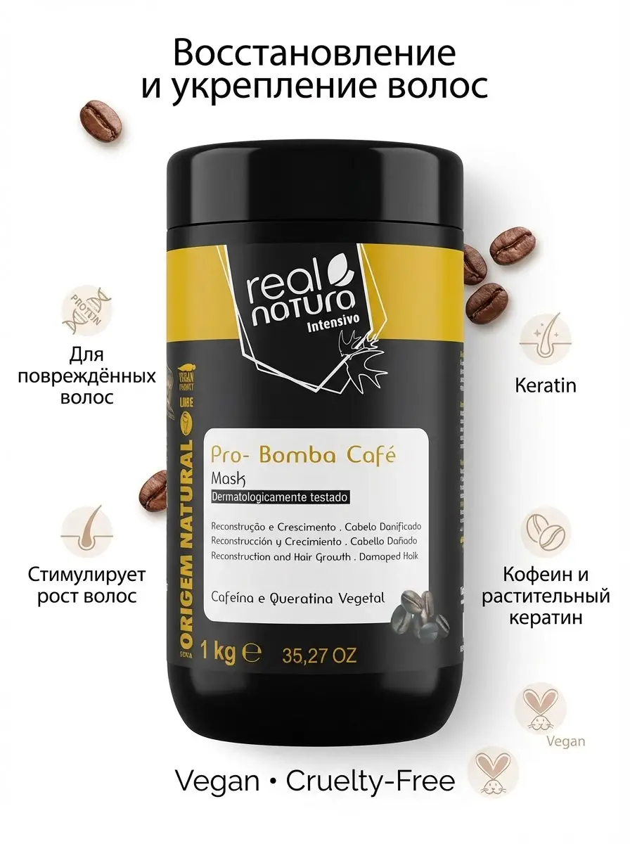 Kahve özü ve keratin amino asitleri ile saçın yapısını güçlendirir, yıpranmış saçları onarır ve saç telini derinlemesine besler.