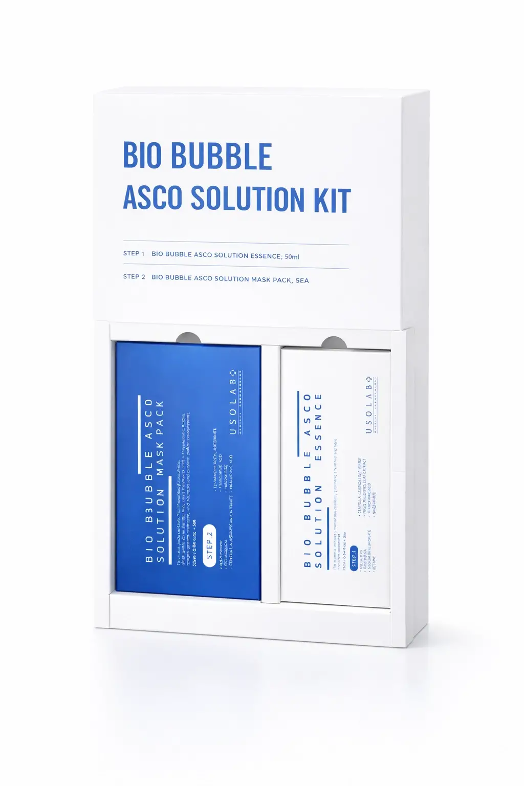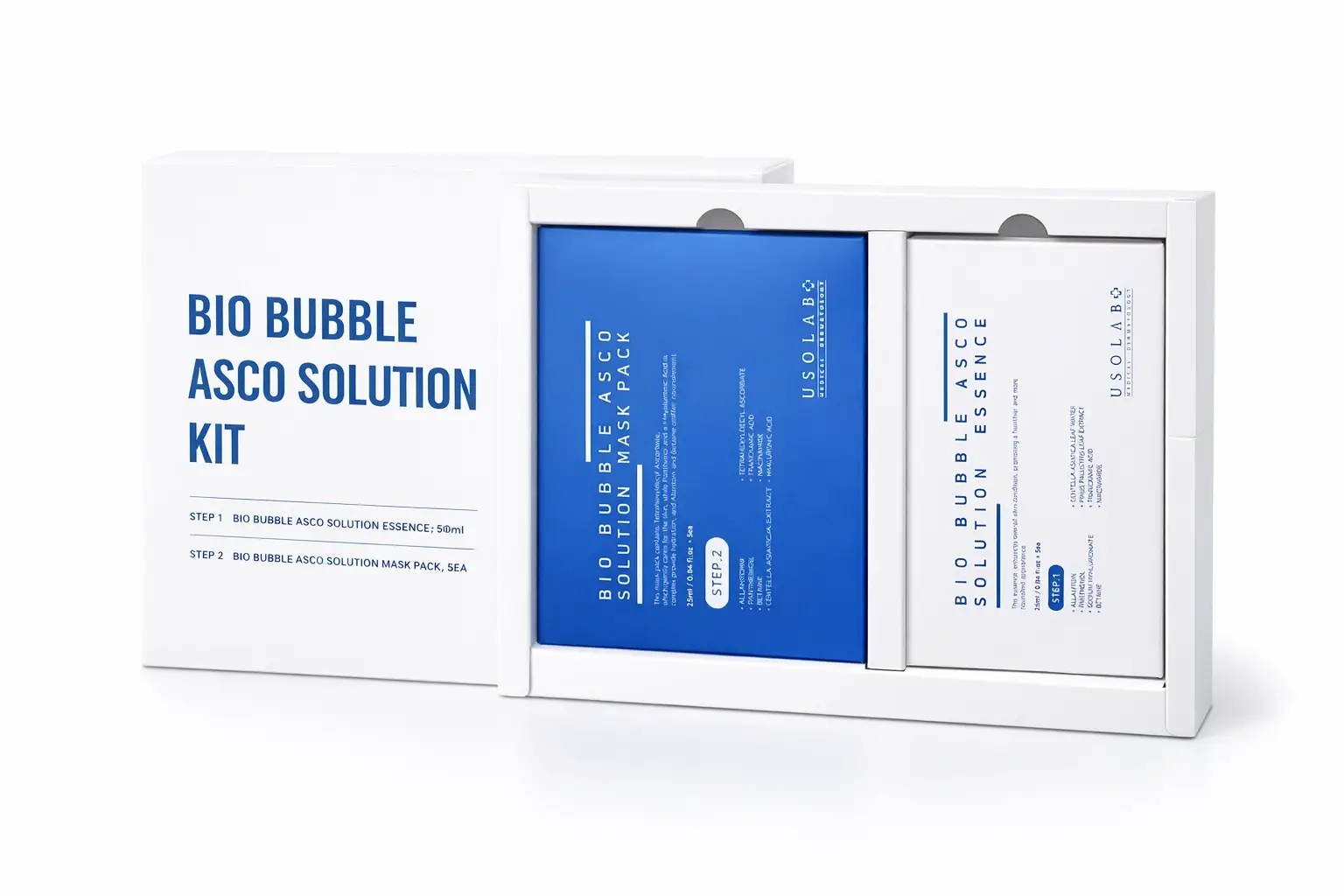 USOLAB Bio Bubble ASCO Solution Kit, profesyonel kullanım için geliştirilmiş iki aşamalı oksijen bazlı cilt bakım setidir.